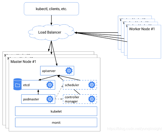 always。这样当他们出现故障意外退出后,能被自动拉起。 - Master 节点上的 kube-scheduler、kube-controller-manager 直接和本机的 API server 通信。