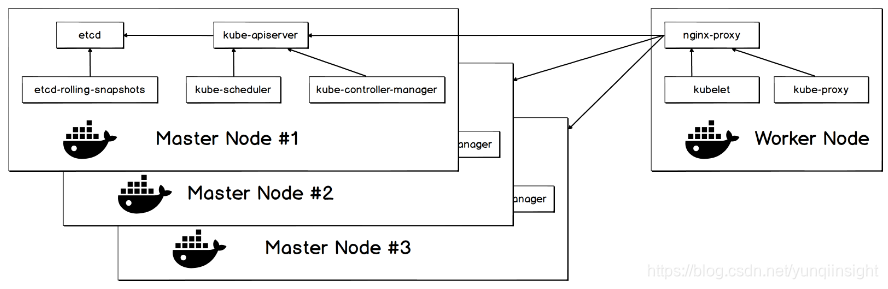 - Worker 节点上的 nginx-proxy 拥有 API server 的地址列表,负责代理 kubelet、kube-proxy 发往 API server 的请求。