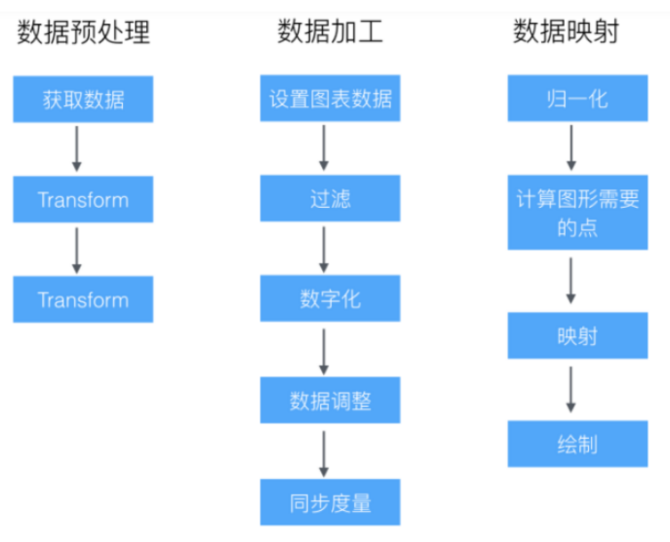 在数据处理模块上,dataSet主要通过state状态管理多个dataview视图,实现多图联动,或者关联视图。dataView则是对应的是每一个数据源,通过connector来接入不同类型的数据,通过tranform进行数据的转换或者过滤。最后输出我们理想的数据,dataSet是与g2分离的,需要用到的时候可以加载; 在图形映射模块上,度量 Scale,是数据空间到图形空间的转换桥梁,负责原始数据到 [0, 1] 区间数值的相互转换工作,从原始数据到 [0, 1] 区间的转换我们称之为归一化操作。我们可以通过chart.source或者chart.scale('field', defs)来实现列定义,我们可以在这对数据进行起别名,更换显示类型(time,cat类型等);
