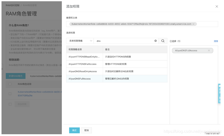 找到对应的 RAM 角色,打开RAM控制台,找到对应的角色名称,添加【AliyunDNSFullAccess】权限。