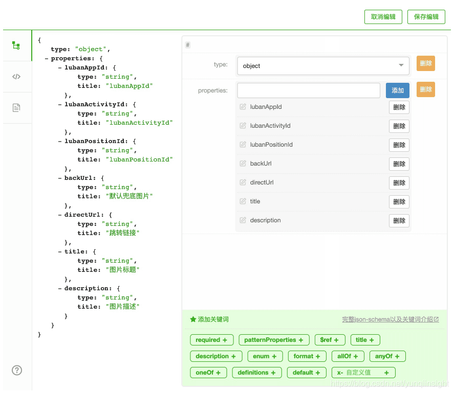 这个 schema 是用 json 描述的。技术同学在前端页面上开发实体资源位后,需要在我们的系统中创建对应的虚拟资源位,并通过一个图形化的 json schema 编辑器来定义这个资源位需要消费的数据结构
