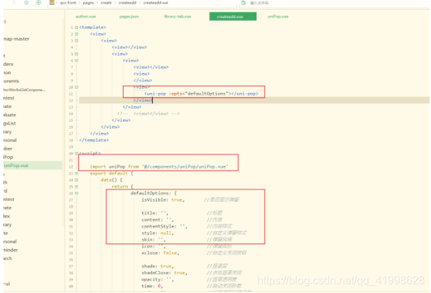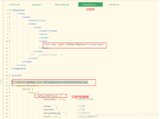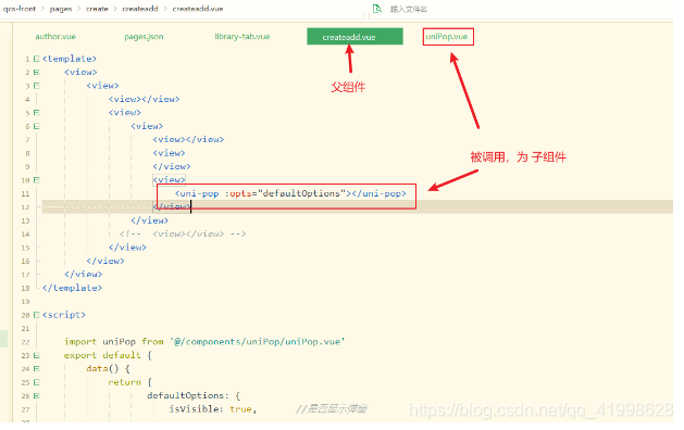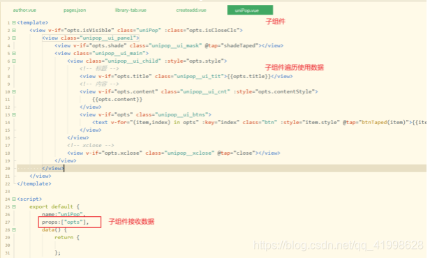 <uni-pop :opts="defaultOptions"></uni-pop>import uniPop from '@/components/uniPop/uniPop.vue'子组件使用父组件内的数据: