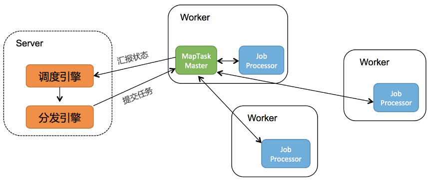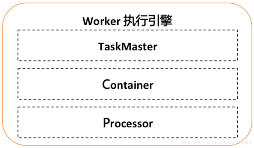Worker总体架构参考Yarn的架构,分为TaskMaster, Container, Processor三层: