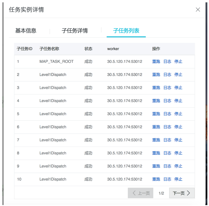如上图,子任务列表可以看到每个子任务的状态、机器,还有重跑、查看日志等操作。
