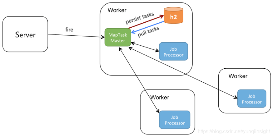 - MapTaskMaster收到map方法,会把task持久化到本地h2数据库。