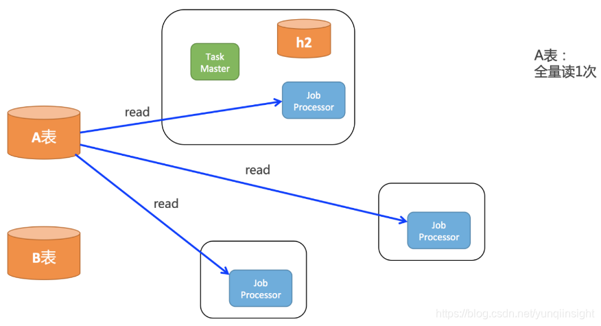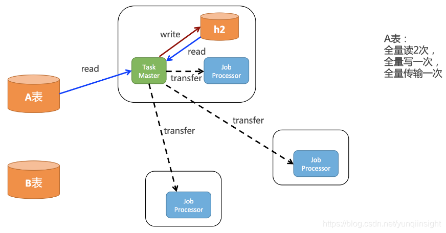 如上图所示,root任务一开始会全量的读取A表的数据,然后会全量的存到h2中,pull线程还会全量的从h2读取一次所有的task,还会分发给所有客户端。所以实际上对A表中的数据: