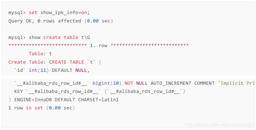 AliSQL 针对用户没有建 PK 的表,默认添加一个隐含主键,以加速 slave 端的 SQL apply。 查看方法: