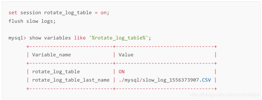 AliSQL 8.0 针对 slow log 收集过程中,对用户实例的影响,以及truncate带来的阻塞可能,提 供了rotate slow log table的功能,影响更小,更快捷,并保证零数据丢失的收集方式。