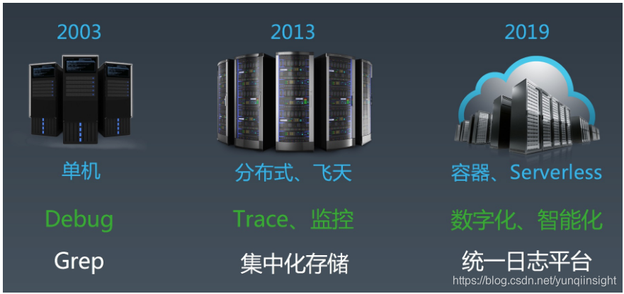 - 随着单机系统成为制约阿里业务发展的瓶颈,为了真正的Scale out,飞天项目启动:2009年开始了飞天的第一行代码,2013年飞天5K项目正式上线。在这个阶段各个业务开始了分布式改造,服务之间的调用也从本地变为分布式,为了更好的管理、调试、分析分布式应用,我们开发了Trace(分布式链路追踪)系统、各式各样的监控系统,这些系统的统一特点是将所有的日志(包括Metric等)进行集中化的存储。