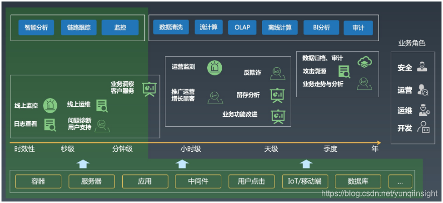 日志不仅仅是服务器、容器、应用的Debug日志,也包括各类访问日志、中间件日志、用户点击、IoT/移动端日志、数据库Binlog等等。这些日志随着时效性的不同而应用在不同的场景:
