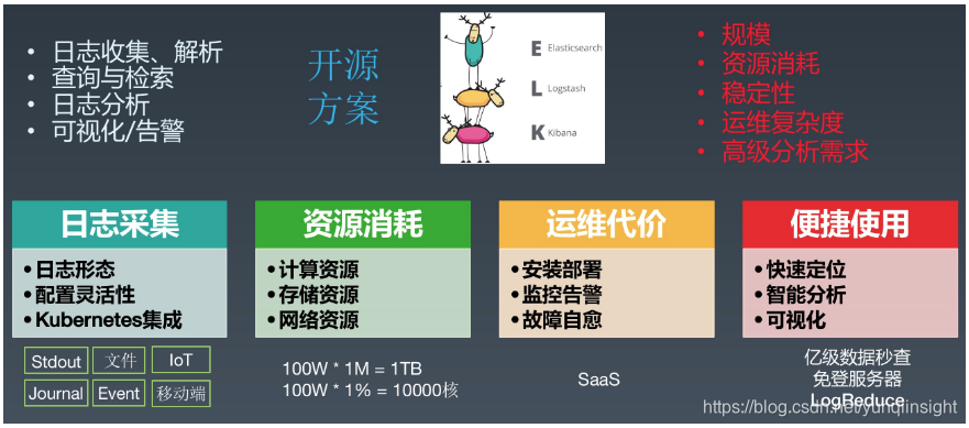 - 运维代价:运维一套日志平台的代价相当之大,因此我们不希望每个用户搭建一个Kubernetes集群时还需再运维一个独立的日志平台系统。因此日志平台一定是要SaaS化的,应用方/用户只需要简单的操作Web页面就能完成数据采集、分析的一整套流程。