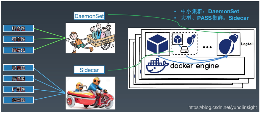 | 部署运维 | 一般,需维护DaemonSet | 较高,每个需要采集日志的POD都需要部署sidecar容器 |