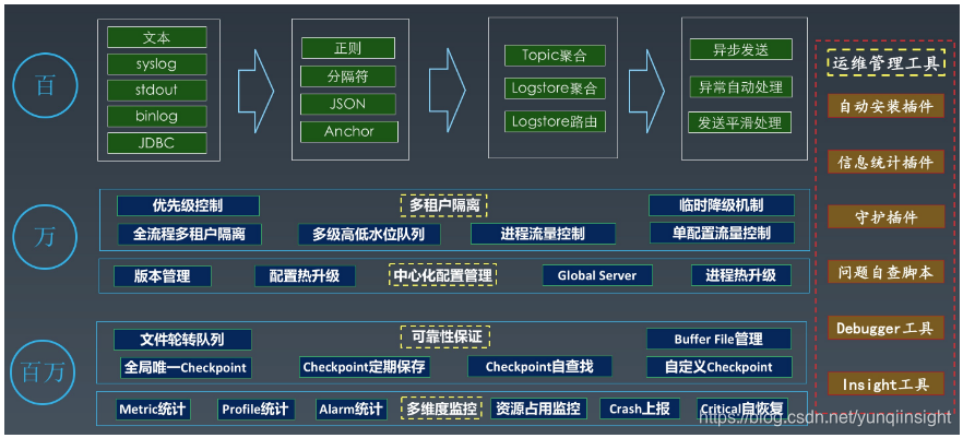 - 万规模:当越来越多的应用方接入,每台机器上可能会有多个应用方采集不同类型的数据,手动配置的接入过程也越来越难以维护。因此我们重点在多租户隔离以及中心化的配置管理,同时增加了很多控制相关的手段,比如限流、降级等。