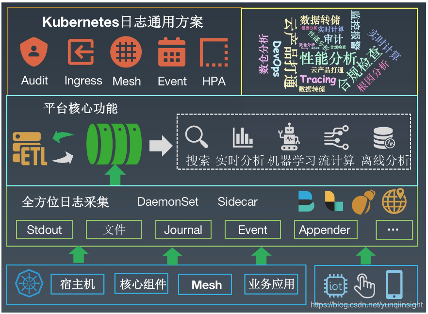 上图是阿里Kubernetes日志平台的整体架构,从底到上分为日志接入层、平台核心层以及方案整合层: