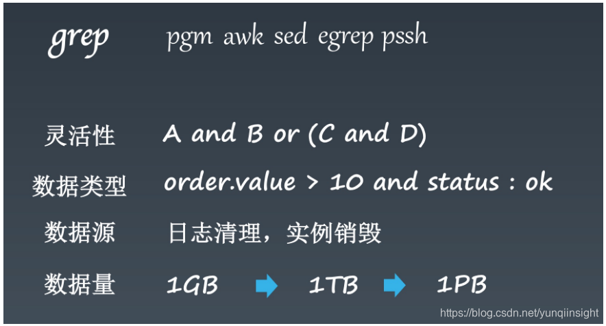 - grep是针对纯文本的分析手段,很难将日志格式化成对应的类型,例如Long、Double甚至JSON类型。