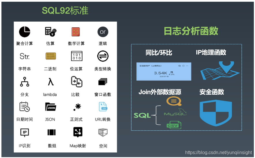 因此我们平台原生集成了日志分析、可视化、告警等相关的功能,尽可能减少用户配置链路。通过多年的实践,我们发现用户最容易接受的还是SQL的分析方式,因此我们分析基于SQL92标准实现,在此基础上扩展了很多针对日志分析场景的高级函数,例如: