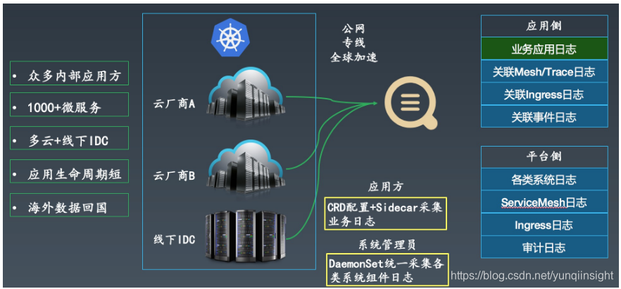 某大型游戏公司在进行技术架构升级,大部分业务会迁移到基于Kubernetes搭建的PAAS平台上,为提高平台整体的可用性,用户采集混合云架构,对于日志的统一建设与管理存在很大困难: