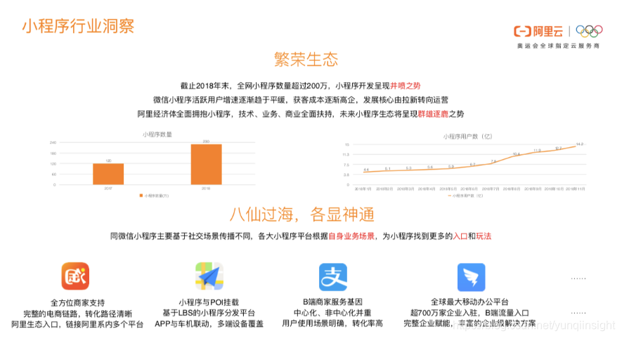 阿里巴巴正在做的事情是:会全面的拥抱小程序,为小程序提供全面的技术、业务、生态的支持,能够帮助我们的企业在未来的云生态里面走的更远。