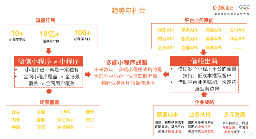 第二个是流量的价值,流量的价值在于由单一的微信生态流量逐渐转变为全网的流量,因为我们有越来越多的App加入到小程序的战场。除此之外,像阿里内部的高德、钉钉、淘宝是有大量的企业能力,大量的设备能力的数据在里面,通过这些能够帮助大家更好的获取流量。