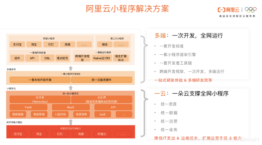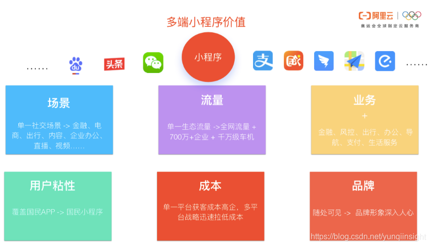 阿里巴巴想做的事情就是我们希望类似于 Android 这样一个开放联盟,能形成整个除了阿里内部,包括阿里生态公司,包括外部的一些公司,都能共用整个小程序的一个框架,共用小程序的一个体系,这是当时对外宣称要做一云多端目的。