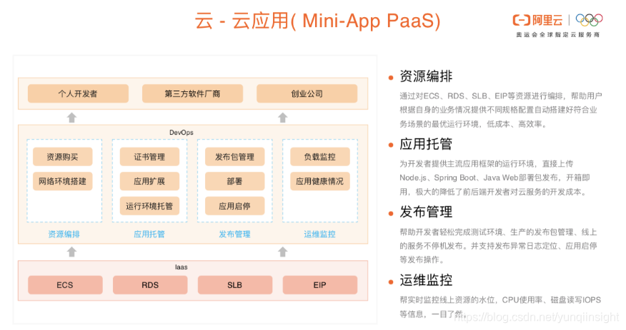 云应用核心是期望帮助大家后端有应用状态下的运维部署的成本。对应到这张图我们可以看到,最底层大家公用的其实都是阿里云的ECS,RDS,如果服务多,还有SLB,公网的出口IP,都基于最底层的s层资源来帮助大家来做后端应用的运维交互。