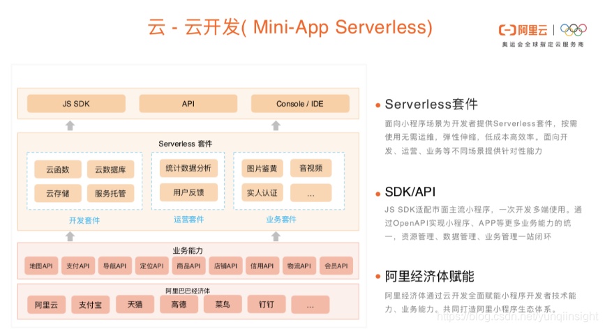 具体到业务会更多,阿里经济体大家想核心想使用的业务能力,比如:云视频、内容安全能力等都会通过当前的 Serverless 的套件对外透出。另一个是小程序云的整体价值,前面强调的一云多端的一云目的是什么,一云并不是希望大家都把数据统一的放在阿里云上,一云的核心对客户支撑的价值在于我们把所有的资源都聚拢在一起,而不是面向不同的场景,来提供不同的后端服务。这样是一种极大效率的降低。那另外一个是期望大家数据能统一,有了数据以后,我们才好有后续基于数据的运营,基于数据的业务分析和扩展,这是我们希望做到一云的效果,通过一朵云来支持整个小程序业务的发展,支持企业,支持我们个人开发者业务的发展。