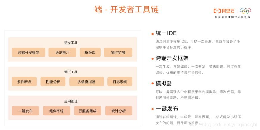 第一个部分是研发工具。可以通过阿里小程序的IDE可以做到一次开发可以生成符合各个平台运行的小程序。为什么能做到这一点,在于阿里小程序IDE里有一个内容叫跨端开发框架,是通过跨端开发框架,比如:写vue的语言,写完了一次,想发布到支付宝怎么办?去编译一个支付宝的安装包,上传到支付宝的开发平台就可以了。同理,想发布到微信上,同样的一份云代码,只需要做一次编译就可以了,成本会低很多。除此之外,工具链的能量,有跨端开发框架、有对应的语法的提示等,会提供一整套的模板库来帮助大家降低开发成本,还提供了插件扩展能力,让大家做自己想要的能力。