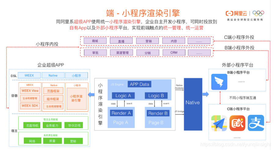 阿里内部的APP绝大部分我们定义成超级APP,超级APP超级在哪里?它跟普通的APP有什么不一样?超级APP里面其实是有个宿主概念,宿主本身会提供通用的基础的能力,比如:系统原生的网络能力、业务能力等,这些能力都会通过宿主APP来提供。另外一方面,在宿主APP上面会提供一系列的容器,比如:小程序渲染引擎,在 Native 里可能会有页面框架、组件框架等管理的能力。在前端写H5页面,会有阿里内部的 WEEX 开发框架等等。为什么要有这样的东西,有了这样的东西后大家就可以很好的扩展。假如把容器都开放出去,在业务场景下有自己的APP,你也有了这一整套的容器后,这时候来做小程序,不仅可以放在阿里的APP里,可以在支付宝上能跑,也能在自己APP里跑,这是当前超级APP的一个价值点。