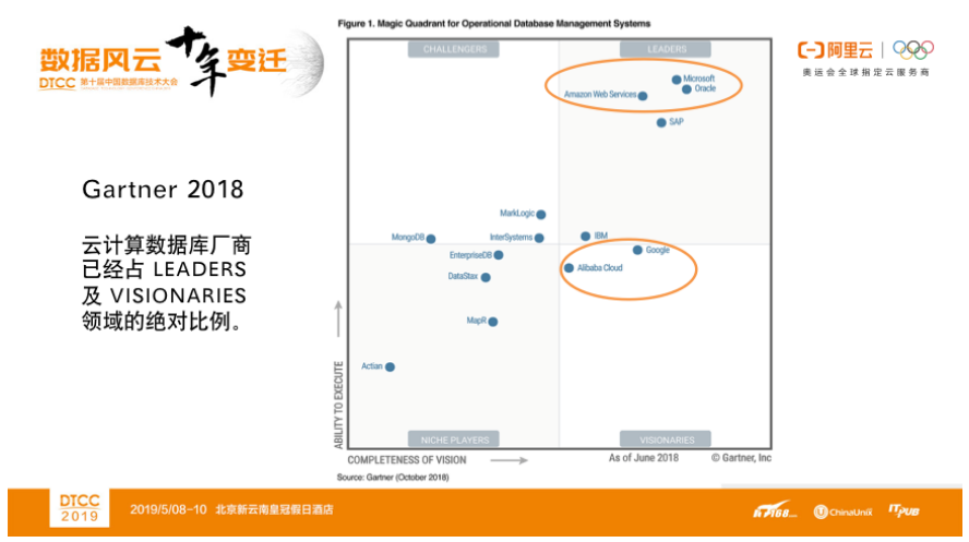 对于数据库技术而言,“云”已经成为大家无法忽视的技术趋势。在Gartner 2018年的数据库魔力四象限里面,云计算数据库厂商已经占LEADERS及VISIONARIES领域的绝对比例,这也代表了业界对于云的认可。