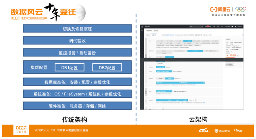 除了数据库架构设计之外,传统架构和云架构在做安装配置的时候也会有所不同。在传统架构下,DBA需要去规划数据库所有的一切,包括操作系统、硬件以及各种安装准备以及验收、切换等一系列演练。在云架构之下,整体的配置、安装以及部署是不需要DBA敲各种命令或者安装各种业务系统的,操作系统、参数优化以及整体的HA只需要在云控制台上点击几下就可以配置完成,无论使用阿里的公共云还是私有云都是这样的状态。这些就是在管理模式方面或者在系统创建过程中已经能够看到的变化。