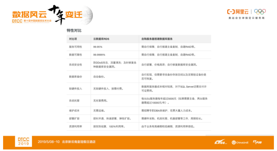 实际上,云数据库最终提供的是一个服务,其包括了系统的可靠性、可用性、安全、备份等一系列的东西,当建立完云数据库这些都是配置完成的,无需DBA进行二次配置。当然,如果DBA有自己配置的需求,阿里云所提供的云数据库服务也会提供API接口进行调配,或者也可以通过阿里云的管理平台进行操作,而不像传统情况下需要非常高的数据库初始建设费用。