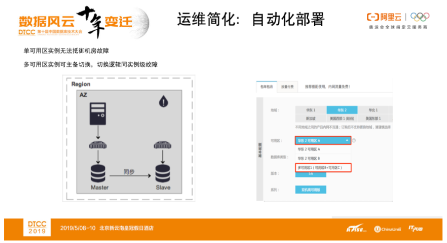 以往都会说需要部署一个主备集群,而今天如果想要部署主备集群也会在一个IDC中心进行部署。如果想要部署跨IDC的主备集群,在传统架构下往往需要购买光纤、光缆,并且需要确定光纤、光缆的延迟情况,判断其所造成的延迟是否能够接受。而在云数据库架构之下,这些信息都不需要进行管理,所需要管理的就是在购买云数据库时进行选择,比如选择跨中心的主备就可以直接建立起来,因此这种复杂架构的构建并不需要自己来规划,可以节省DBA去做传统底层业务处理的时间。