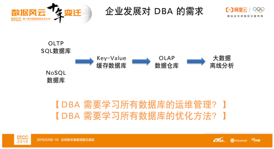随着数据库技术的发展,企业对于DBA的需求也不断提高。从对于OLTP这样的SQL数据库和NoSQL数据的掌握,进一步演进,为了解决性能问题可能需要Key-Value缓存数据库,之后建立OLAP数据仓库,再之后实现大数据离线分析。