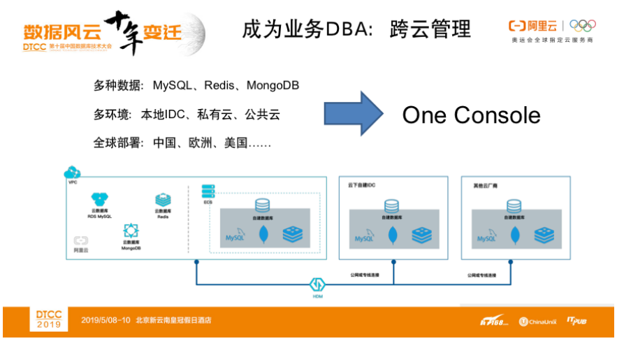 今天,阿里云本身在运营云,而其实阿里云也会提供跨云的管理工具。无论用户使用的是哪里的云,只要管理的是MySQL、MongoDB、Redis数据库都会提供HDM工具来协助用户管理跨云数据库。