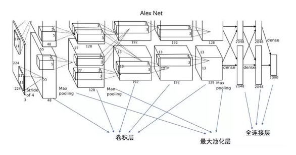 Alex Net, 因为 GPU 内存的原因,Alex 使用了两块 GPU 对模型做了切割,本质上的卷积层是用于特征提取, 最大池化层用于提取强特征及减少参数,全连接层则是所有高级特征参与到最后分类决策中去。