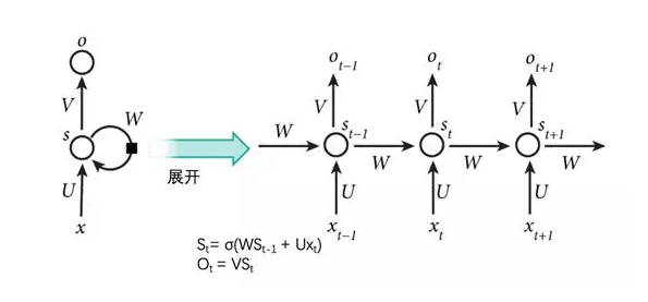 在RNN中,x1 , x2, x3, xt 是在时序上不一样的输入,而 V, U, W 三个矩阵则是共享。同时 RNN 网络中保存了自己的状态 S。 S 随着输入而改变,不同的输入/不同时刻的输入或多或少影响 RNN 网络的状态 S。而 RNN 网络的状态 S 则决定最后的输出。