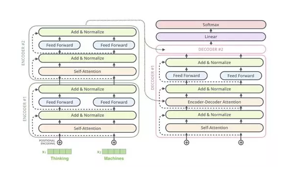 Encoder 阶段:输入“Thinking Machines”,对应词向量,叠加位置向量 Positional Encoding,对每个位置做 Self-Attention 得到;Add&Norm 分两步,residual connection即,layer Normalization 得到新的,对每个位置分别做 feed forward 全连接和 Add&Norm,得到一个 Encoder Layer 的输出,重复堆叠2次,最后将 Encoder Layer 输出到 Decoder 的 Encoder-Decoder Layer 层。
