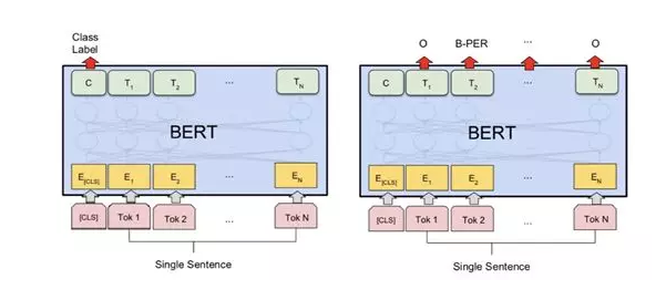 针对不同任务,BERT 采用不同部分的输出做预测,分类任务利用[CLS]位置的embedding,NER 任务利用每个 token 的输出 embedding。