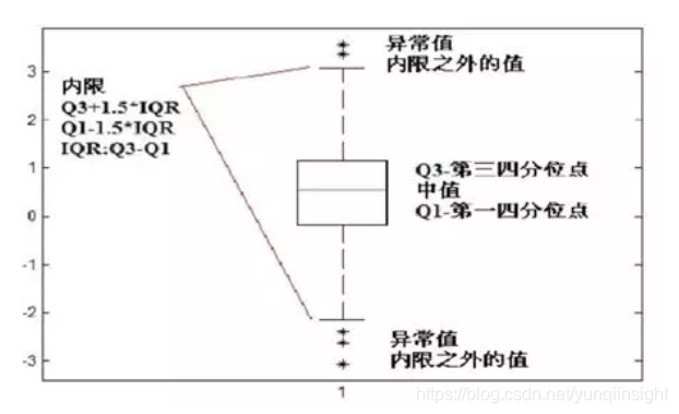 箱线图算法不需要数据服从特定分布,比如数据分布不符合高斯分布时可以使用该方法。该方法需要先计算第一四分位数Q1(25%)和第三四分位数Q3(75%)。令IQR=Q3-Q1,然后算出异常值边界点Q3+λIQR和Q1- λIQR,通常λ取1.5(类似于正态分布中的