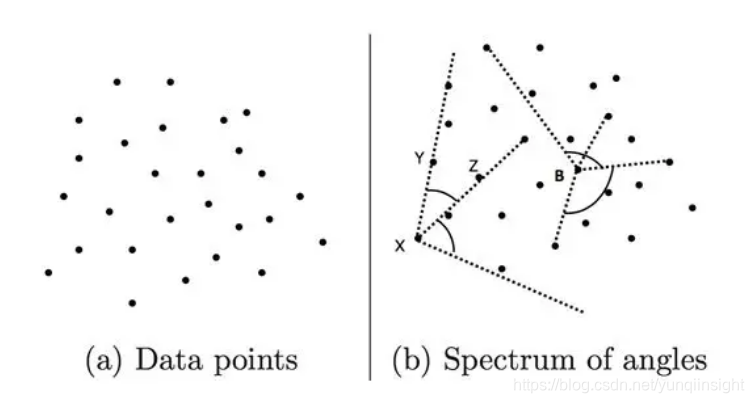 变化都较小,则点X是异常点。通过余弦夹角公式易得角度: