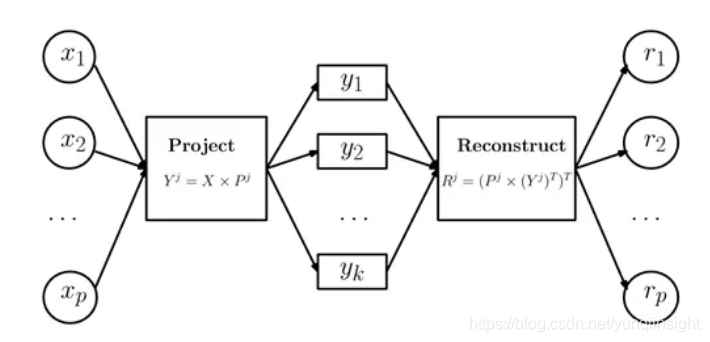 数据集X在主成分空间的投影可以写成Y=XP,注意可以只在部分的维度上做投影,使用top-j的主成分投影之后的矩阵为: