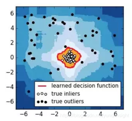 孤立森林(Isolation Forest)假设我们用一个随机超平面来切割数据空间, 每切一次便可以生成两个子空间。接着继续用一个随机超平面来切割每个子空间,循环下去,直到每个子空间里面只有一个数据点为止。那些密度很高的簇是需要被切很多次才能让子空间中只有一个数据点,但是那些密度很低的点的子空间则很快就被切割成只有一个数据点。如图7所示,黑色的点是异常点,被切几次就停到一个子空间;白色点为正常点,白色点聚焦在一个簇中。孤立森林检测到的异常边界为图7中红色线条,它能正确地检测到所有黑色异常点。