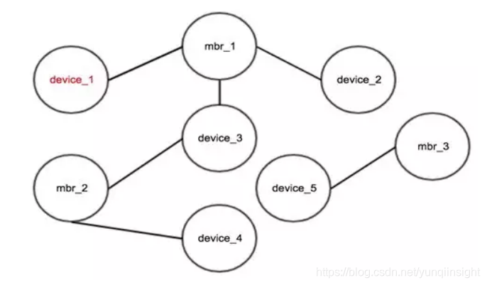 如图9所示,device是设备id,mbr是会员id,节点之间有边表示设备上有对应的会员登录过,容易看出device_1、device_2、device_3、device_4是同人,可以根据场景用于判断作弊,常用于挖掘团伙作弊。