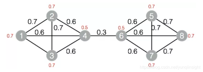 标签传播图聚类算法是根据图的拓扑结构,进行子图的划分,使得子图内部节点的连接较多,子图之间的连接较少。标签传播算法的基本思路是节点的标签依赖其邻居节点的标签信息,影响程度由节点相似度决定,通过传播迭代更新达到稳定。图10中的节点经标签传播聚类后将得2个子图,其中节点1、2、3、4属于一个子图,节点5、6、7、8属于一个子图。