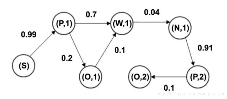 如图11所示,用户在搜索引擎上有5个行为状态:页面请求(P),搜索(S),自然搜索结果(W),广告点击(O),翻页(N)。状态之间有转移概率,由若干行为状态组成的一条链可以看做一条马尔科夫链。