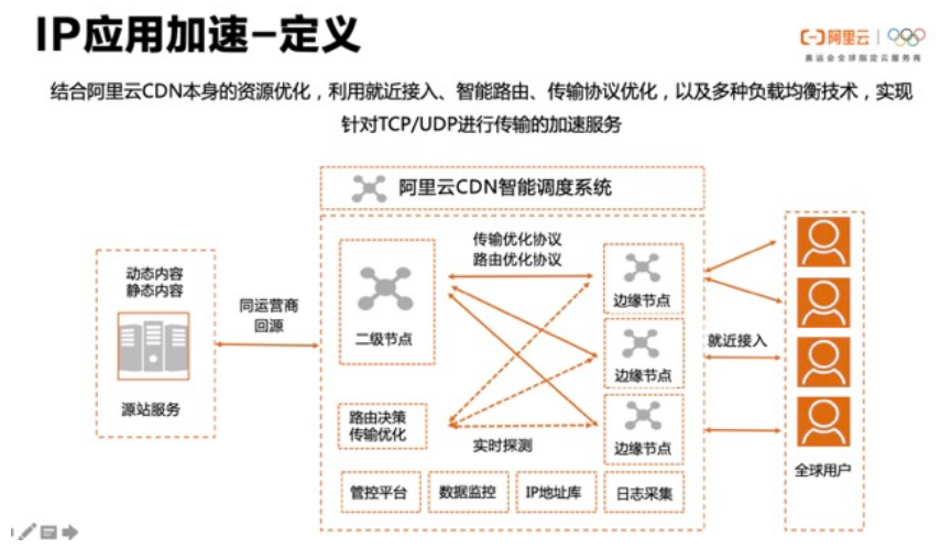 IP应用加速架构如下图所示,首先,全球用户就近接入边缘节点,通过阿里云的智能调度系统接入二级节点,中间采用传输协议优化和路由优化,选取最快、最优的路径。最后,二级节点到源站则选择相同运营商进行回源。