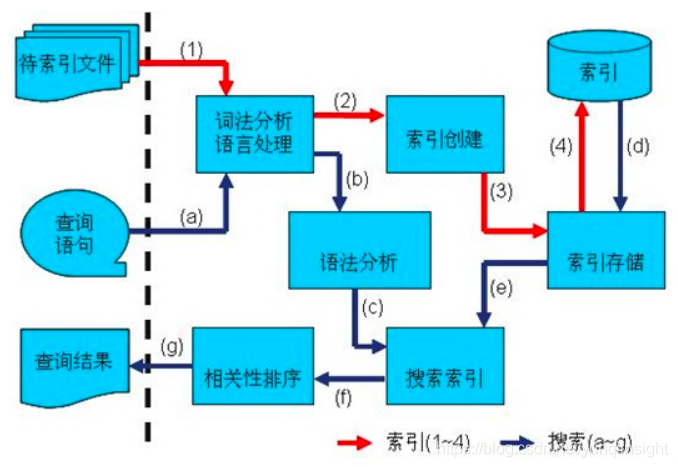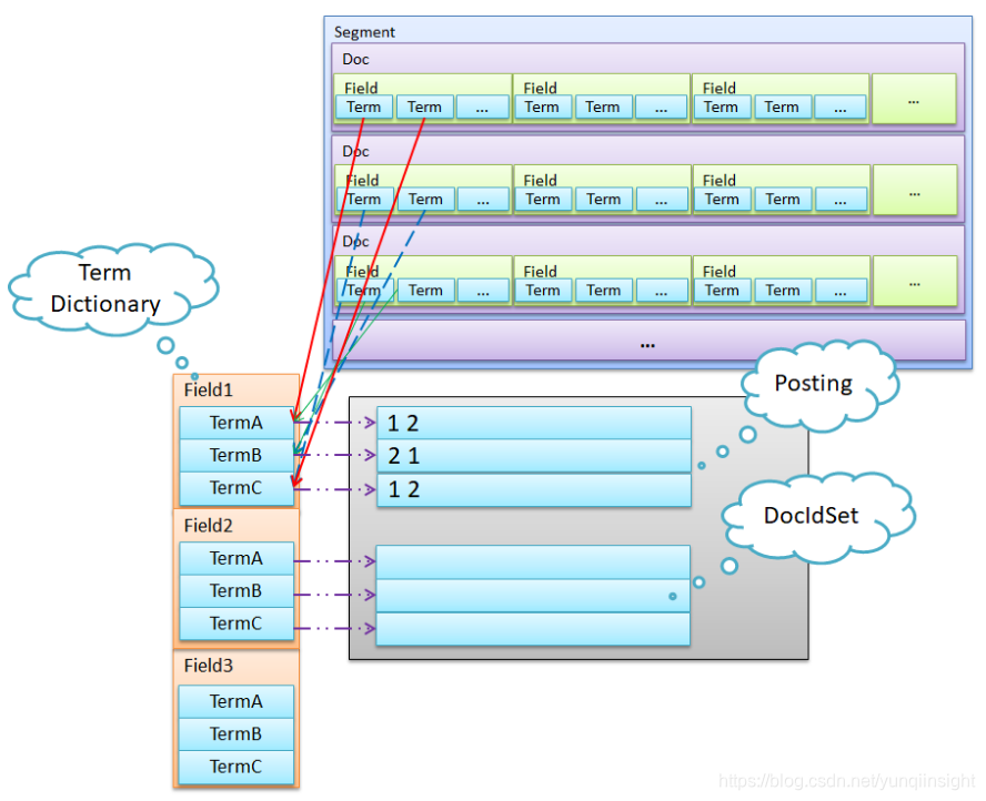 以 Lucene 为例,简单说明一下 Lucene 的存储结构。从大到小是Index -> Segment -> Doc -> Field -> Term,类比 MySQL 为 Database -> Table -> Record -> Field -> Value。