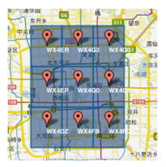 - 首先确定天安门的Geo Hash为 WX4G0B,(6位区域码约 0.34平分千米,约为长宽600米区域)