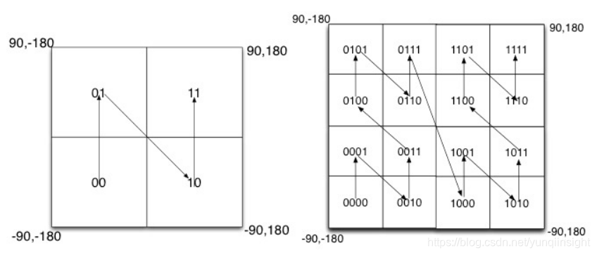 如图所示,我们将二进制编码的结果填写到空间中,当将空间划分为四块时候,编码的顺序分别是左下角00,左上角01,右下脚10,右上角11,也就是类似于Z的曲线。当我们递归的将各个块分解成更小的子块时,编码的顺序是自相似的(分形),每一个子快也形成Z曲线,这种类型的曲线被称为Peano空间填充曲线。