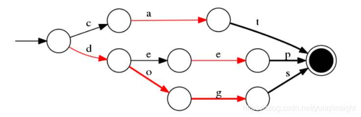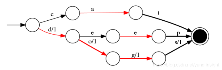 举例:对“cat”、 “deep”、 “do”、 “dog” 、“dogs” 这5个单词构建FST(注:必须已排序),结构如下: